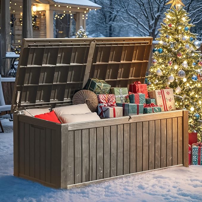 - GOOD MATERIAL- With two strong support hydraulic rods, this box delivers a comfortable angle for opening and closing; upgraded smooth PP surface is durable , waterproof, and sunproof, the wood grain imitation can be easily maintained