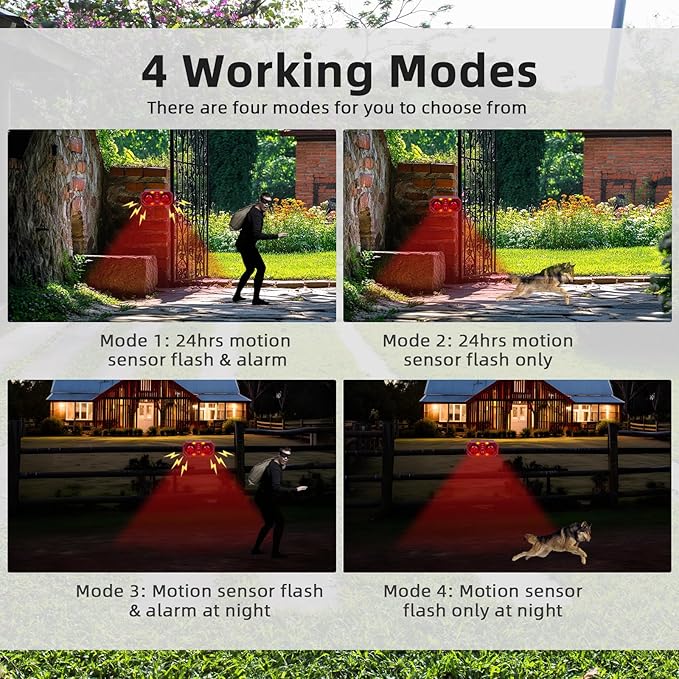 - Multiple Mode Options - Choose from four modes to suit your needs: Mode 1: 24-hour motion sensor with sound and flashing lights. Mode 2: 24-hour motion sensor with flashing lights only. Mode 3: Nighttime motion sensor with sound and flashing lights. Mode 4: Nighttime motion sensor with flashing lights only. Whether you need around-the-clock protection or prefer a quieter night mode, this motion-activated alarm has you covered.