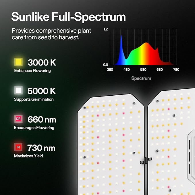 - Full-Spectrum Sun-like Lighting: These LEDs deliver optimal full-spectrum light (390nm-730nm, 3000K, 5000K) and include 660nm deep red, 730nm far red, and 395nm UVA; This design maximizes PAR output, improving germination rates, promoting plant growth, extending blooming periods, and increasing yields
