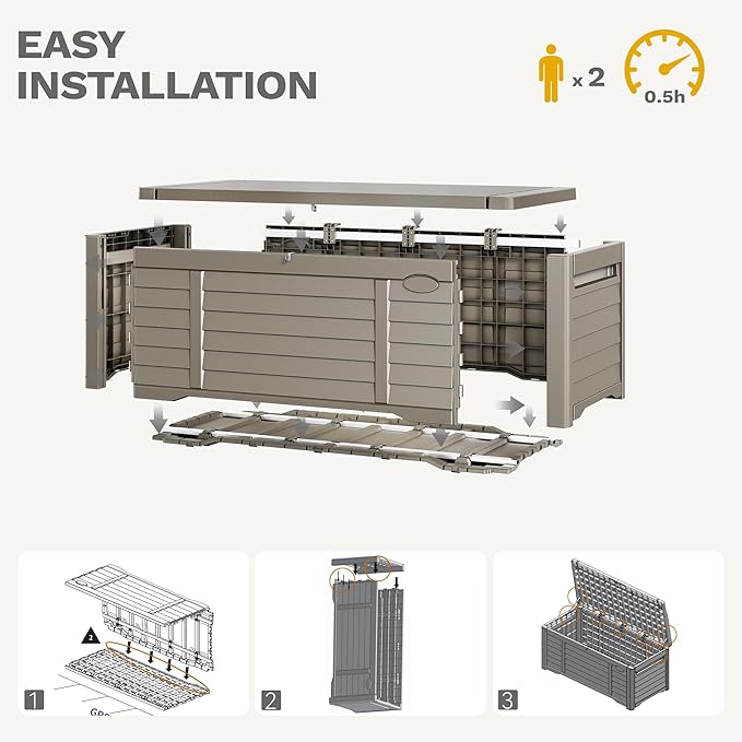 - Versatile Box: The deck box's top boasts an impressive weight-bearing capacity of up to 660 pounds; Product not only serves as a secure storage solution but also doubles as a versatile bench seat in your outdoor space