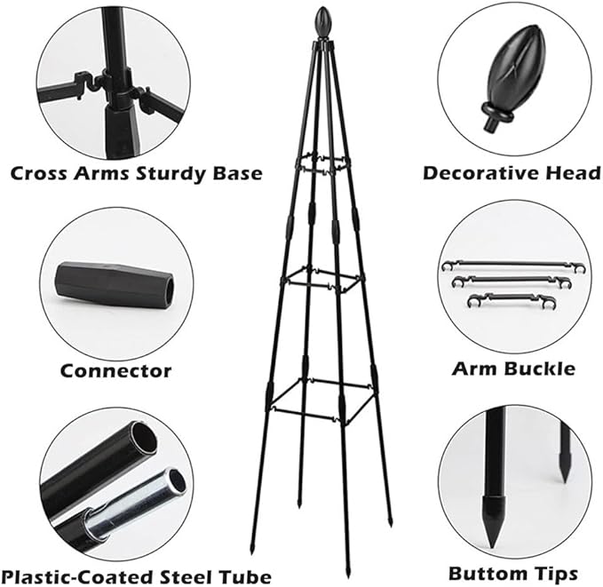 - 【Decorative Obelisk Design】Featuring an elegant obelisk shape, this trellis not only supports plant growth but also adds a decorative element to your garden. The sleek design enhances the visual appeal of your outdoor space, making it a focal point in any setting.