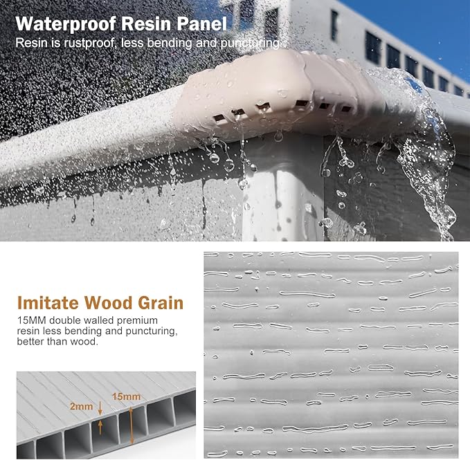 - Premium Durability and Weather Resistance: Crafted with 14mm tough double-wall resin and an impact-resistant dark floor, this storage unit ensures long-term durability. Its waterproof and moisture-proof panels, along with UV resistance, ensure worry-free use in diverse weather conditions.