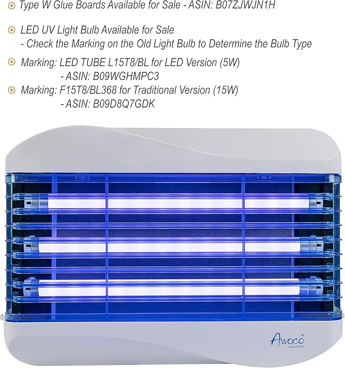 - 1 Year USA Limited Warranty on Fly Trap - LED bulb is consumable depending on power condition which is a 3 months warranty. If the lightbulb fails within 3 months, contact us for a free LED bulb replacement limited to USA only. Awoco has LED bulbs and glue boards available. Lamp Overall Dimensions: 21-3/8"W x 4"D x 14-1/4"H. Glue Board Dimensions: 15-5/8" x 10-5/8".