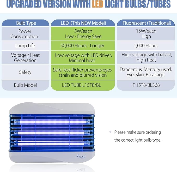 - Upgraded Version with LED UV Light - New upgraded LED UV lights are more energy efficient than fluorescent light bulbs while providing a brighter lighting. Save money and maintenance cost with these new LED UV lights that are more durable and don’t flicker near the end of their life. No flickering prevents eye strain and blurred vision compared to fluorescent light bulbs.