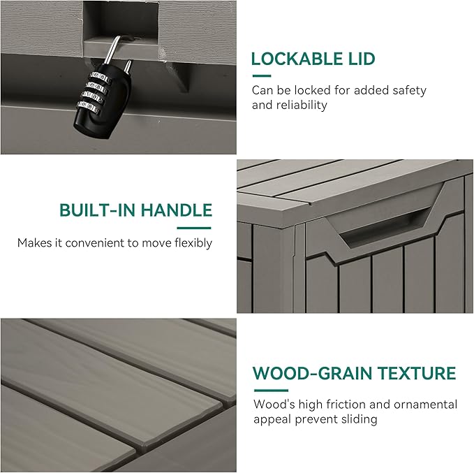 - Attention to Detail: Equipped with hydraulic rods, the patio storage box offers smooth and impact-resistant functionality with easy opening and secure closing of the lid without risking finger injuries; The lockable lid protects your items effectively