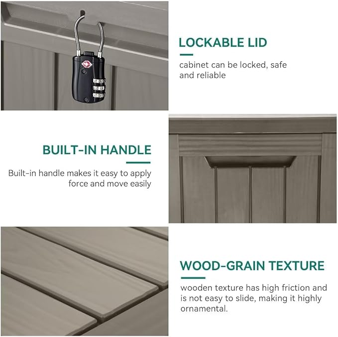 - Thoughtful Design: Equipped with hydraulic rods, the outdoor storage box facilitate smooth lid operation. The lockable lid ensures that your belongings remain secure, whether you are storing valuable tools or other important items