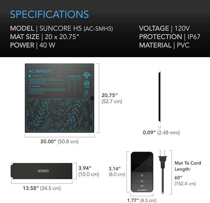 AC Infinity SUNCORE H5, Seedling Mat 20” x 20.75” with Digital Thermostat Controller for Exact Temperature Levels, Waterproof Heating Pad for Indoor Gardening, Hydroponics, Germination, Cloning