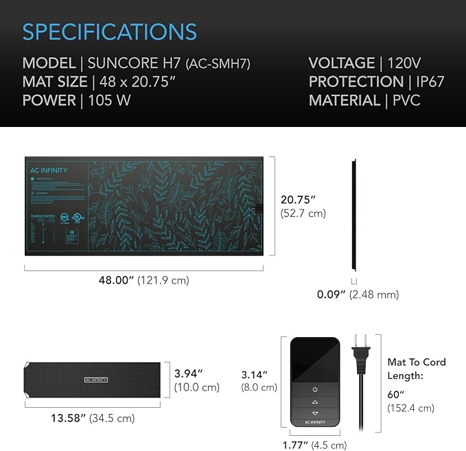 AC Infinity SUNCORE H7, Seedling Mat 48” x 20.75” with Digital Thermostat Controller for Exact Temperature Levels, Waterproof Heating Pad for Indoor Gardening, Hydroponics, Germination, Cloning