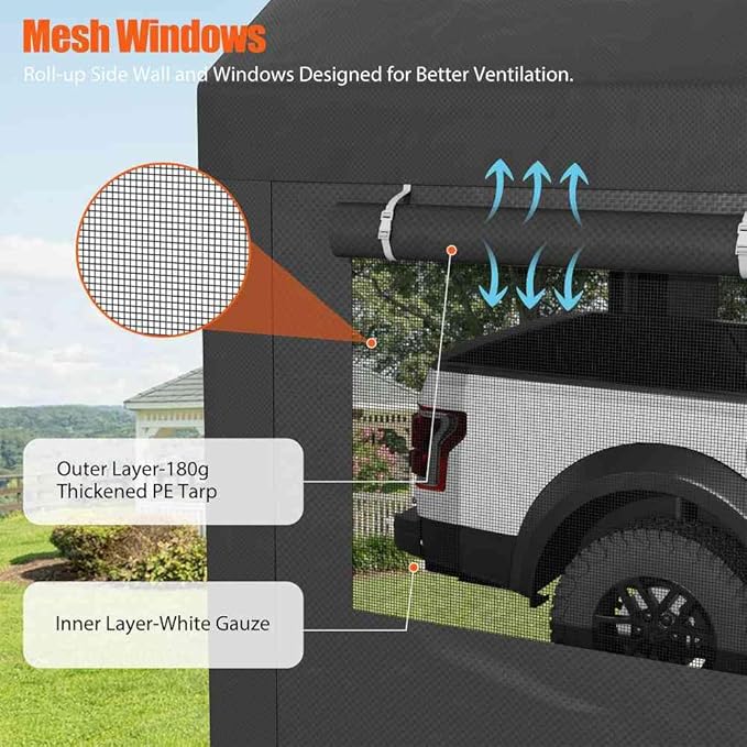 - 【Removable Sidewalls Window and Doors】This carport shelter has 2 removable sidewalls with Roll-up Ventilation Windows. It can help with airflow, and prevent moisture. It also has two removable doors with zippers. You can roll the doors up or down as you wish. Or remove all the sidewalls and doors, only leave the canopy cover on for outdoor activities.