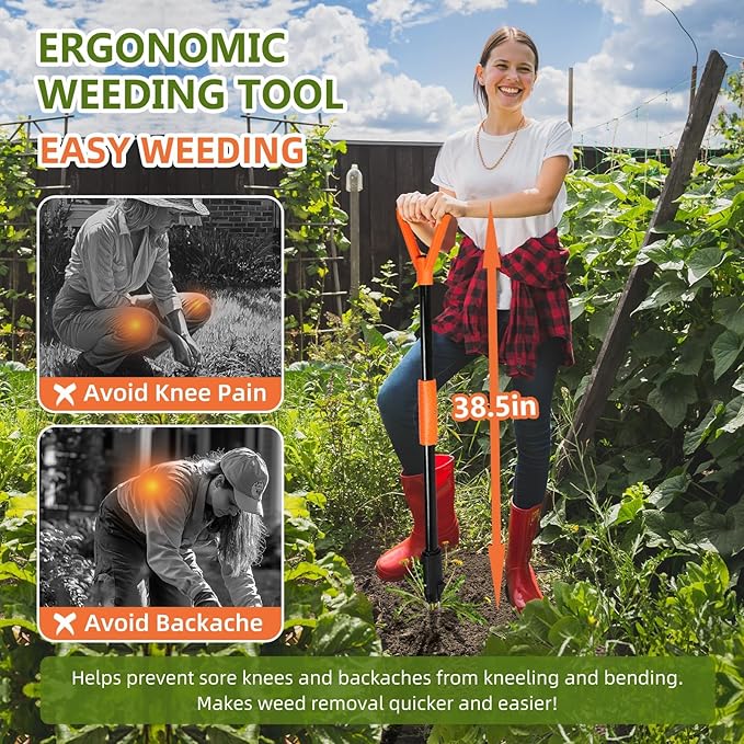 - MANUAL WEEDER TOOL -- Our weed puller comes with a 38.58 inch handle for a comfortable experience for most users. Featuring an ergonomic design that reduces stress on your back and wrists during weeding, making you more comfortable in your garden.The handle is designed with a non-slip texture to maintain a firm grip even in wet environments, ensuring safety and convenience during use.