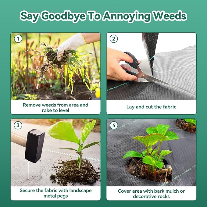 - 【Eco- Approved & Widely Applications】Our polypropylene materia is safe and environmentally friendly, and can be used in organic vegetable gardens. Weed barrier landscape fabric is versatile and can be used in a variety of environments, such as vegetable gardens, flower beds, ground cover, lawns, paved roads, sidewalks, driveways, or around trees and shrubs.