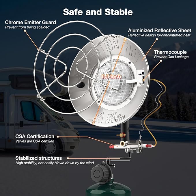 - Safe & Easy to Operate - Covered with CSA certificated regulator and the rustproof chrome emitter guard in the front, this heater will greatly prevent you from being scalded accidentally. With the ignition hole on the side, you are able to use matches to safely light up the burner, which mounts directly to a 1 lb propane cylinder.(Propane cylinder not included