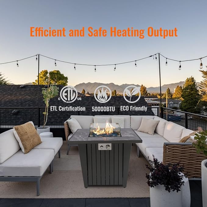 - 🔥🔥【 Inclined Leg and Art Powder Design】It is firepit table for outside propane.When the fire table is providing you with heat and a wonderful flame, this gas fire pits for outside patio will generate 50,000BTU. Our design requires the Tank must be put outside, so there is no worries.