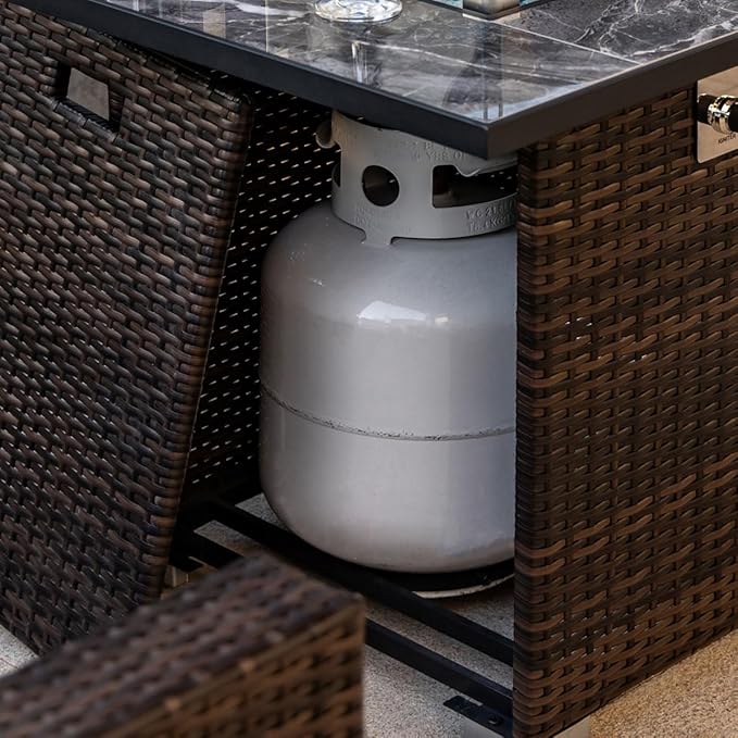 - 🔥🔥【What You Can Get From It】This fire pit tables for outside patio with Marble tabletop, Fire pan and Stainless Steel burner, Gas regulator, Pulse Ignition, Safety thermocouple, all assembled, and wicker panels , Decorative Mixed color Glass Rocks, Waterproof Cover, Steel Lid.