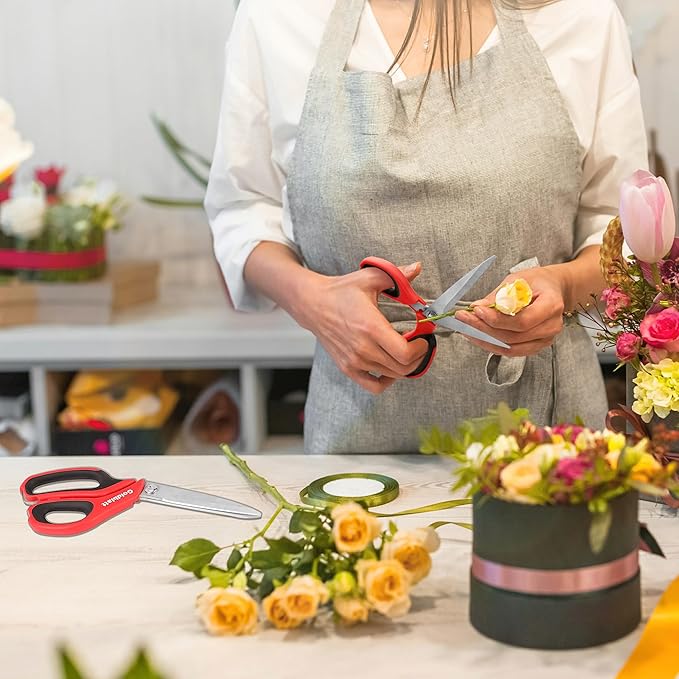 - [Comfortable Grip] Two-color handle of the garage scissors is not easy to slip when using, ergonomically designed handle is wrapped with a non-slip sleeve made of TPR material, self- tensioning spring is convenient