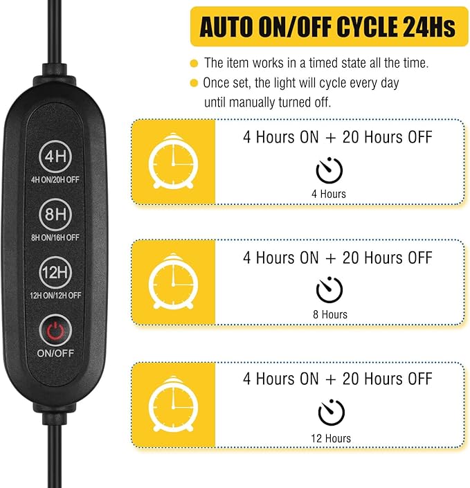 - 【CYCLE AUTO ON/OFF TIMER】The grow light works in a timed state all the time, The timer function of the growth light allows for 4/8/12 Hours timing for plant needs. and it works in a timed state all the time. Once being set up, the grow light will automatically turn off after set hours, and then the plant growth lights turn on and off at the same time on the next day for a 24-hour cycle, copy daily turn on and off times.
