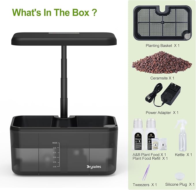 - 【Everything You’ll Receive】This complete hydroponics seed pod kit includes: 1 Hydroponic Garden Base, 1 Power Adapter, 8 Plant Pods, 1 Bag of Clay Pebbles, A & B Nutrient Solutions, 1 Refill Packet, 1 User Manual, 1 Pair of Tweezers, and 2 Silicone Plugs. (Seeds are not included.)