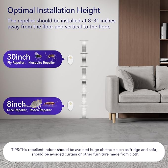 - Pest Repellent Ultrasonic Plug In: Plug the ultrasonic repellent into the socket, press the button, and the blue light will turn on, proving that it can be used normally. Pressing the button a second time will emit 25-85k Hz ultrasonic waves to repel mice and pests. It should be installed at 8-31 inches away from the floor and vertical to the floor