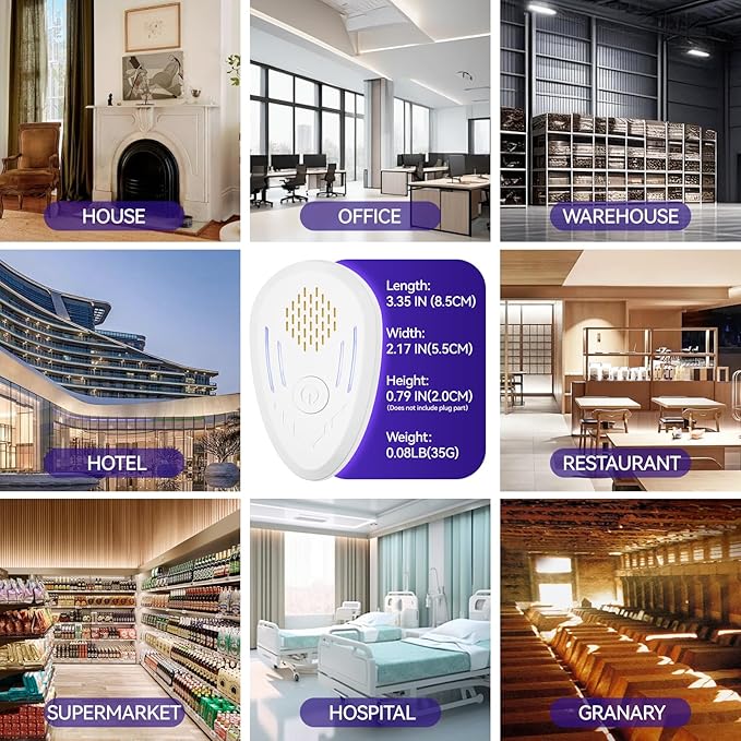 - Wide Coverage: The effective coverage of each mouse repellent is up to 80 to 120 square meters. Because ultrasonic waves cannot penetrate walls and solid objects, it is best to install an rodent repellent in each room. But for areas with serious Vermin, we suggest install 2 or more devices for other room. They aren't effective for other rooms if you install device at one room. It's widely used in home, warehouse, office, restaurant, supermarket, hospital, granary, etc