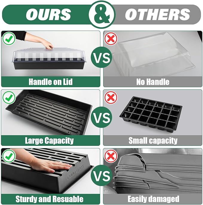 - 【Complete Kit + Stress-Free Service】5 Trays, 5 Domes & 24/7 Support—Your Success, Guaranteed! Jumpstart your garden with everything you need: 5 heavy-duty trays + matching domes (no flimsy extras!). Whether you’re growing microgreens, rare succulents, or a backyard farm, we’ve got your back. Email us anytime—questions, tips, or even a virtual high-five when your first sprout pops up. Grow with confidence