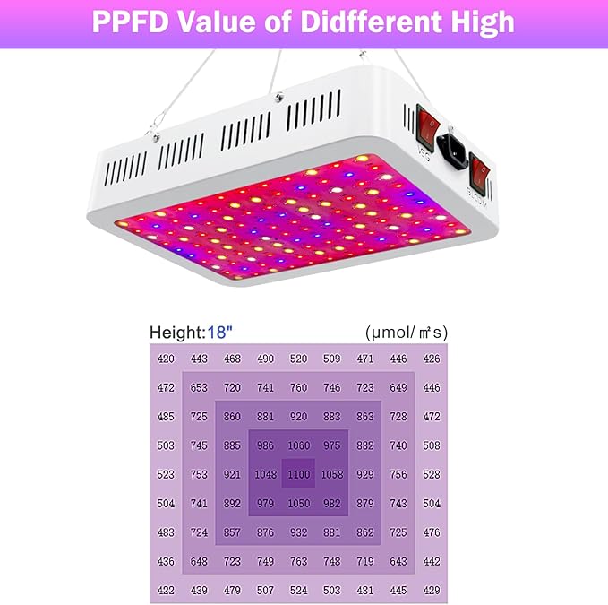 - Veg & Bloom Switch: Through a wide plant growth testing, the Veg and Bloom switch, which designed to provide proper light for plants in different growth stages to greatly increase your harvest. Veg switch is the blue LED and white LED designed for seed or seedling growth; Bloom switch is the red LED and white LED designed for flowering/blooming; Both Veg and Bloom switches can for maximum per formance to plants.