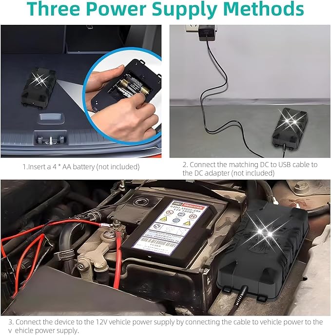 - Three Power Supply Methods: This mouse repellent for cars has a total of three power supply methods [4*AA batteries (item excluding battery) + DC to USB cable + cable to vehicle power]. The flexible power supply method not only allows users to install the rat repellent for cars next to the engine, but also allows users to install the rodent deterrent for car engines in any place such as garages, pavilions, warehouses, etc.