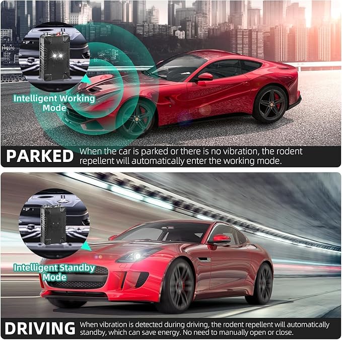 - Professional Rodent Repellent for Car Engines: Rodent are very sensitive to environmental changes, especially to light and sound. The strong white light can stimulate the retina of mice, making them feel uneasy. And the auditory system of rodent is very developed and sensitive to ultrasound. This under hood Rodent Deterrent uses variable frequency output technology, which can emit fluctuating ultrasound and flashing lights to prevent animals from entering your car, RV, truck, garage...