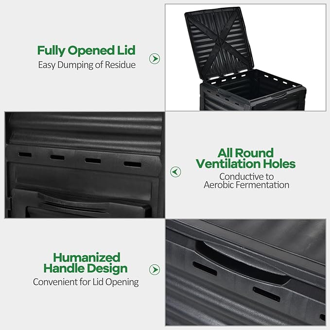 - 🍃【Convenient Composting & Great Circulation System】Simply open the large lid, fill it with a large amount of waste and after 6-8 weeks (less in the hot summer) you will have rich soil from the bottom door. In addition, there are 12 vents on each side to increase the contact area with oxygen and improve the efficiency of fermentation.