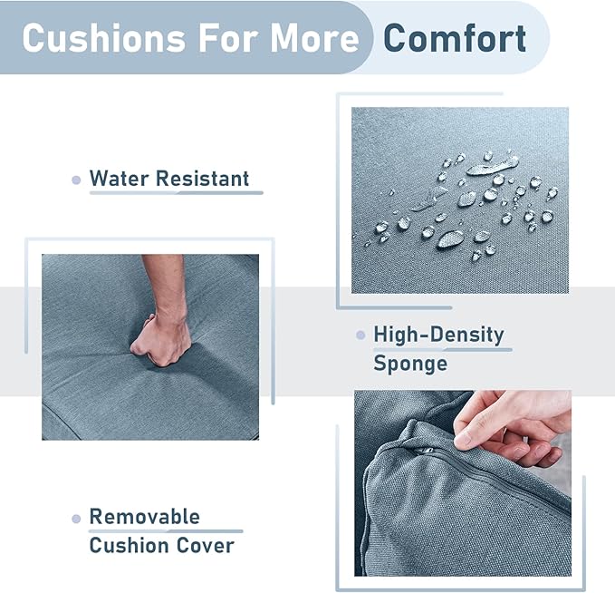 - 4" Soft Thickness Cushions: Patio furniture cushion is filled with high-density sponge and the cover is made of UV Resistant outdoor olefin fabric, which provides better comfortable seating experience. Removable zipper design, easy to replace and clean.
