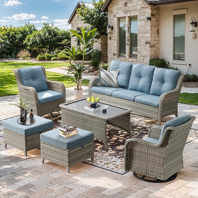 - Patio Furniture Sets: This outdoor furniture includes 1 x 3-seater sofa, 2 x ottomans, 2 x outdoor swivel chairs, 1 x coffee table that provide seating for up to 5 people. Hand-woven rattan adds texture to the outdoor sofa, the patio conversation set can be widely used on patio, porch, backyard, balcony, poolside and gardens, providing a comfortable conversation space for you and your guests