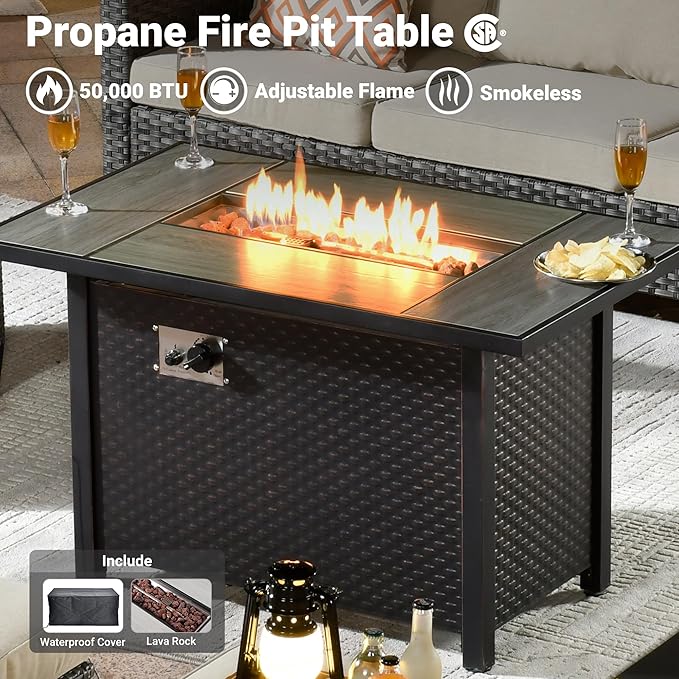 - Outdoor Fire Pit Table: 42 inches rectangular patio gas propane fire table has 55000 BTU powerful heat output with CSA certification. Equipped with a flame adjustment device, the simple switch control panel.