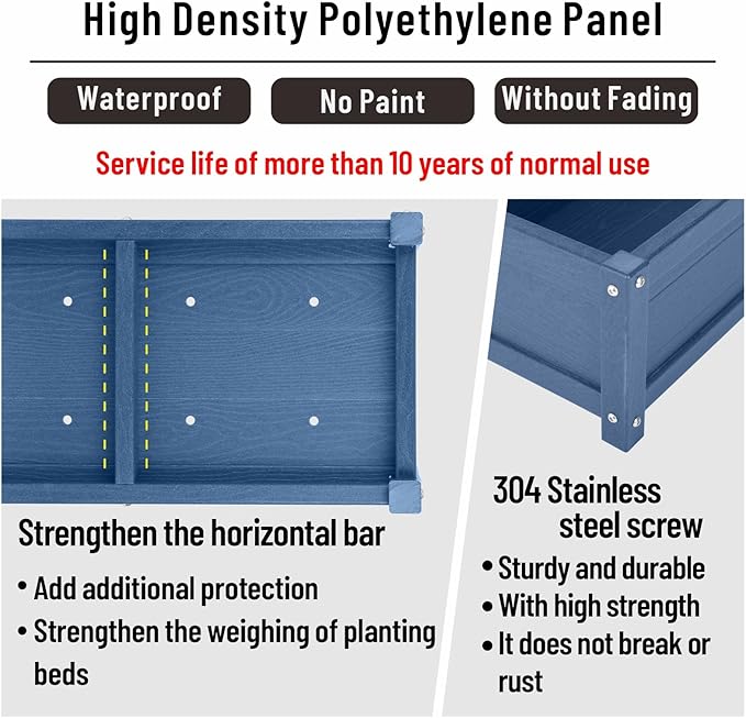 - Safety:Raised planter box outdoor made from HDPE,with no water or oil-based coatings, ensuring that your fruits, vegetables, plants, and herbs grow safely