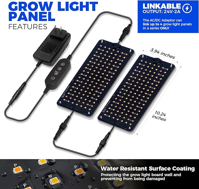 - What You Get: 4 x Barrina Grow Light Panel, 1 x AC/DC Adaptor, 1 x Power Cord with Turn On/Off Timer, 3 x Connecting Cord, 1 x Hook and Loop Tape, 20 x Snap-in Adhesive, 20 x Cable Tie, 5 x wire shelf, 5 x PP pad, 1 x Accessory Kit for Plant Shelf, 1 x Installation Manual