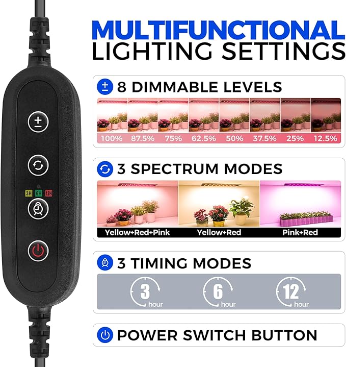 - Multiple Functions: Our plant growing lamp has 3 spectrum modes, 8 dimmable options (100%-87.5%-75%-62.5%-50%-37.5%-25%-12.5%) and 3 cycle timing settings(3H/6H/12H), suitable for every cycle of plant growth, saving electricity while also ensuring the light needs of plant growth. And will take good care of your plants while you are at work or on vacation, easy and convenient