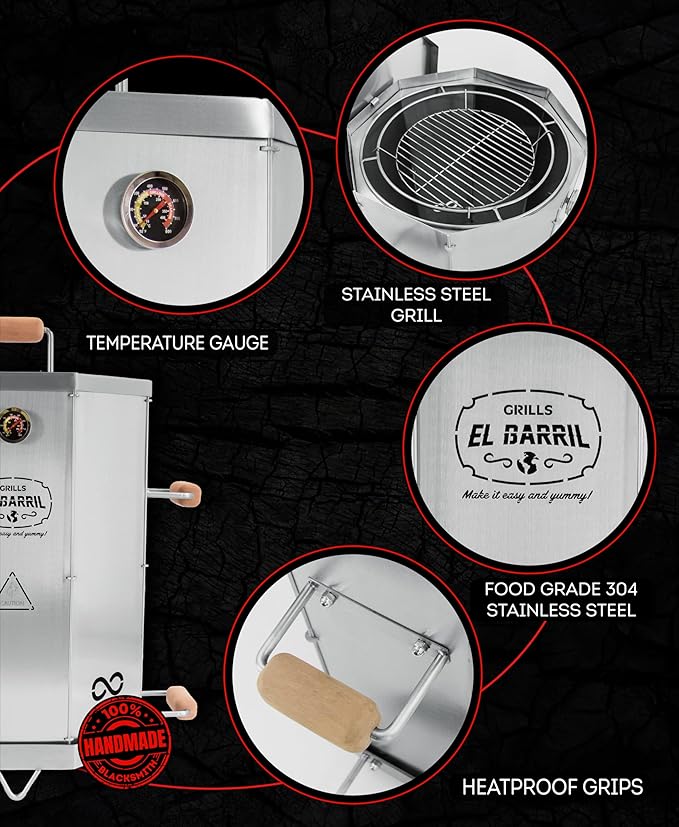 - Smart & Handy: EL BARRIL 20lbs Portable Charcoal Grill Barrel with heatproof handles at sides & on cover top, comes with 14 Hooks, 1 Hook Remover, 1 Grill & its remover, 1 Ventilated Stainless Steel Charcoal Holder & Ashtray, a Temperature Gauge & heavy duty carry bag