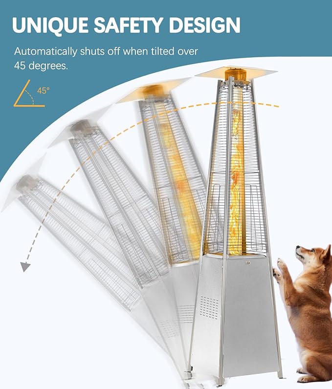 - 🔥【Safety Flame-Out Function】To avoid strong winds or accidental collisions, this outdoor propane patio heater features a safety auto flame out feature. When the heater is tilted more than 45 degrees, the fuel supply will automatically shut in time and the flame will go out automatically. Every product is factory tested for automatic flame failure, so you don't have to worry about safety.