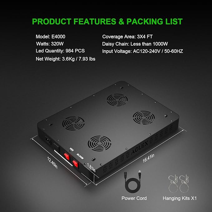 - 【High Yield & Low Power Consumption】Our led grow lights feature 984 high-quality LED beads, boasting an impressive energy efficiency of 2.8 μmol/J. The light's above is made of acrylic glass, which enhances light penetration and overall efficiency. Compared to traditional HPS lights, you can save up to 60% on electricity bills, as our E4000 LED grow light is equivalent to a powerful 1280W HPS light while consuming only 320W!