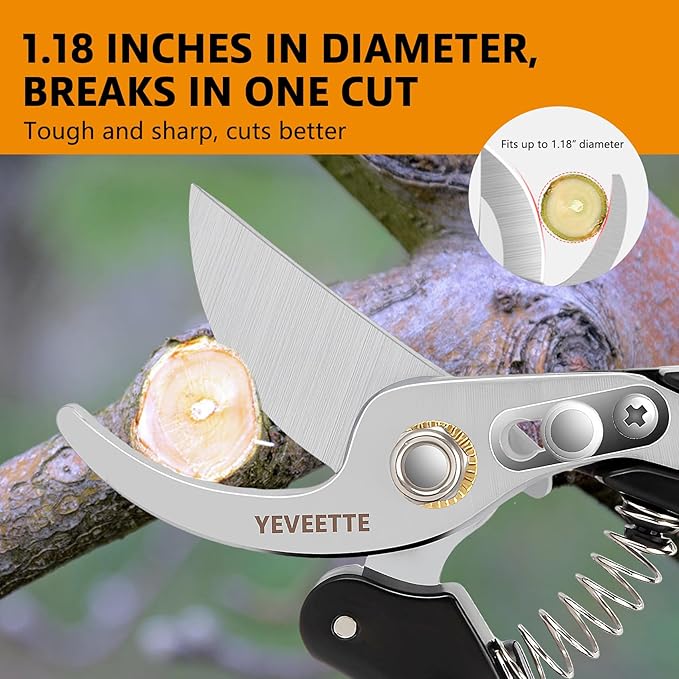 - 【Excellent Quality】: The pruning shears are made of professional SK-5 steel with proper heat treatment, which has high hardness and strength. The anti-rust treatment of electroplating process keeps the blade sharp for a long time, and can easily cut various branches. Double rivet reinforcement makes the garden shears blade firmly fixed and provides a long service life.