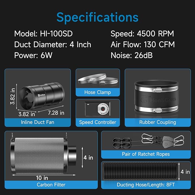- 【Efficient Ventilation System Kit】: Includes Hon&Guan 4" inline duct fan, Speed Controller, 10" High Carbon Filter & 8 Ft Ducting. It’s the ideal choice for moving and circulating air in various ventilation projects; easily and precisely control fan speed and airflow to stabilize and optimize your growing environment