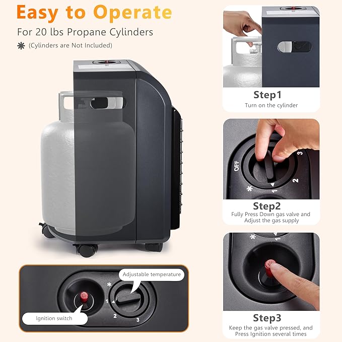 - OUTDOOR HEATER: Our portable heaters require no electricity and support outdoors or in emergency uses. Propane heaters produce more heat than electric heaters, ensuring you stay cozy in any weather. The heater has a collapsible section at the bottom that holds the 20 lb propane tank stable.