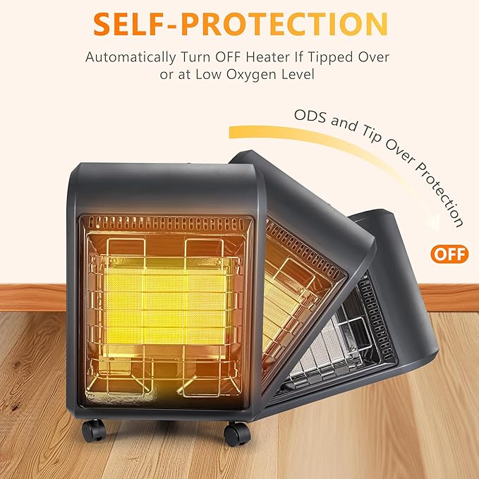 - SAFETY PROTECTION: Built-in Oxygen Depletion Sensor (ODS) and tip-over sensor. The propane heater will automatically shut off if oxygen levels are low or the propane heater is accidentally knocked over. The front of the ceramic panel is fitted with a windscreen to block the wind when outdoors.