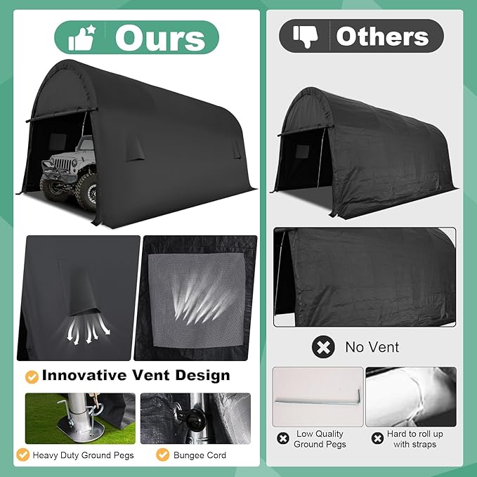 - 【Innovative Vent Design】Our car port canopy tent features 4 innovative ventilation openings that enhance airflow, provide cooling effects, and prevent moisture buildup. This design helps reduce condensation caused by rainwater.