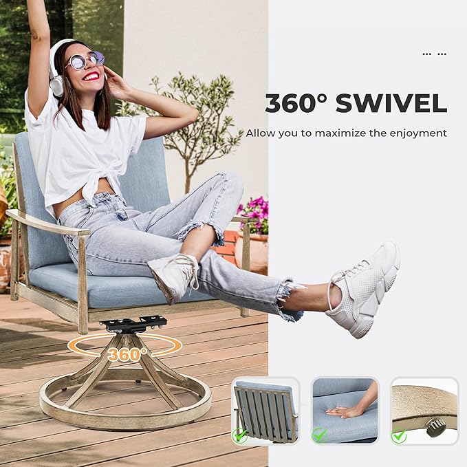 - Dining Chair with Swivel Base: The outdoor dining chair is designed with a 360-degree rotation base, providing greater flexibility than other patio chairs. You can rotate it in any direction to suit your needs, allowing for extra leisure and relaxation.