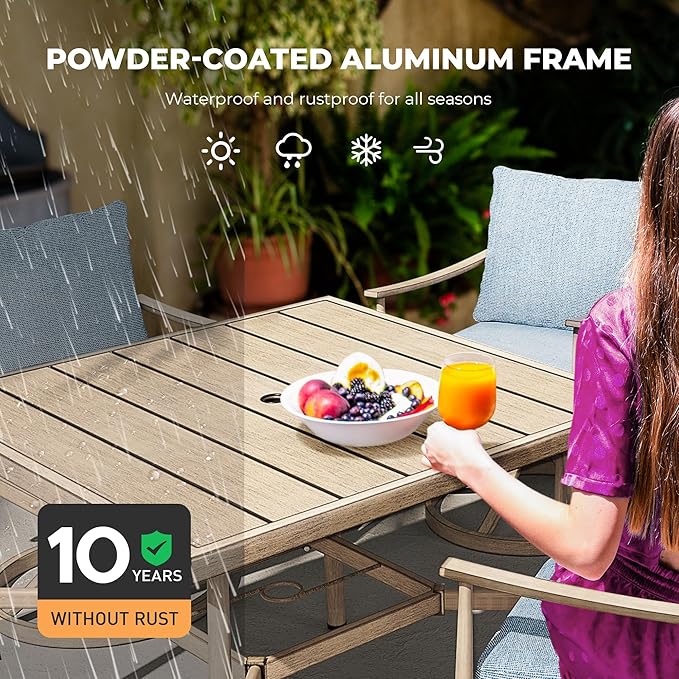 - Spacious Square Table with Umbrella Hole: The 35.6" square tabletop comfortably accommodates up to 4 people, providing enough space to place your drinks or meals. It's ideal for family dinners or parties with friends, ensuring everyone enjoys their outdoor leisure time. And with a built-in 2.2" umbrella hole, you can easily add an umbrella to enjoy shade during sunny days!