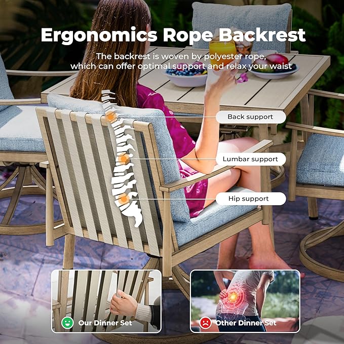 - Unique Backrest with Rope Design: The backrest of each patio dining chair is wrapped with polyester woven rope that provides comfortable and elastic support. With its excellent color retention, it can withstand various outdoor conditions and weather.
