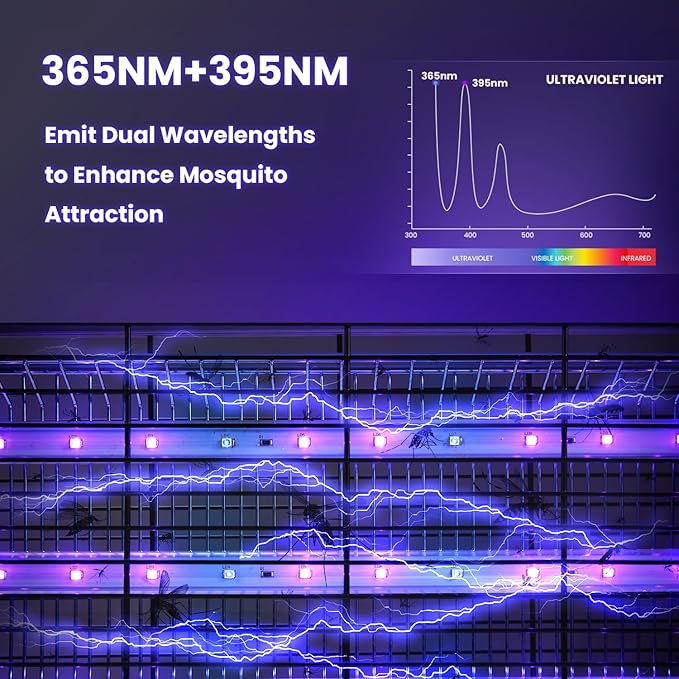 - Efficient Bug Zapper Indoor with 2 Wavelengths: Dual-spectrum UV LEDs (365nm+395nm) mimic human body heat signatures to lure 2X more mosquitoes and bugs than single-wavelength mosquito zappers.