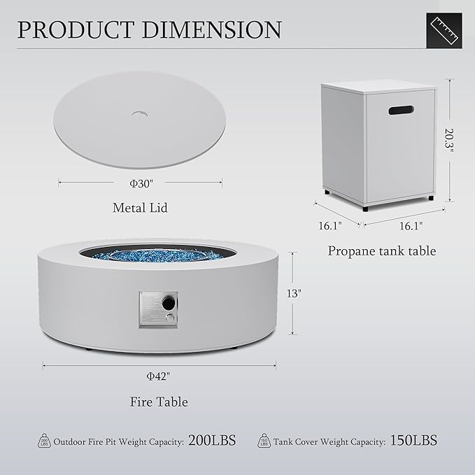 - 【Package Contents】The propane fire pit is delivered in one box and comes with fire pit 1pc, propane tank cover 1pc, rain cover 1pc, detachable burner lid 1pc, propane hose 1pc, glass rocks 1bag and user manual 1pc. Please note that the propane tank cover is located on the bottom of the fire pit table, If you have any questions or need assistance, please contact our customer service team