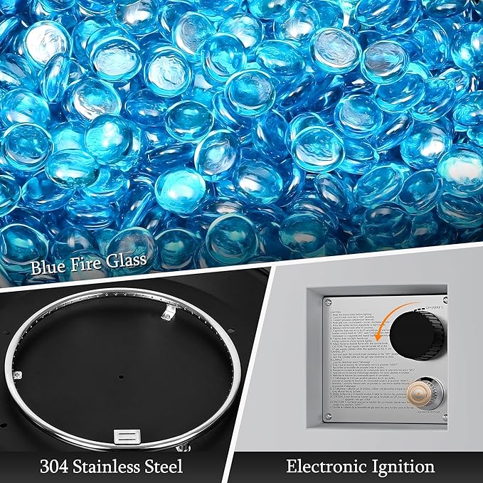 - 【Safety & High Quality】The outdoor firepit table is CSA safety certified, equipped with electronic ignition system, you can easily adjust the temperature by turning the knob after pressing the power switch. The firepits for outside can provide up to 50,000 BTUs of heat output, with a heating diameter of 8. 2 feet, suitable for 4-6 people outdoor party. Besides, the fireplaces are factory burn tested to ensure that the flame will ignite upon delivery