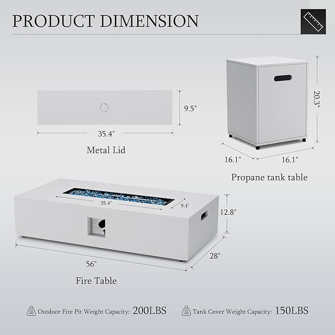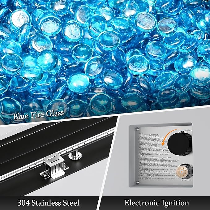 - 【Package Contents】The propane fire pit is delivered in one box and comes with fire pit 1pc, propane tank cover 1pc, rain cover 1pc, detachable burner lid 1pc, propane hose 1pc, glass rocks 1bag and user manual 1pc. Please note that the propane tank cover is located on the bottom of the fire pit table, If you have any questions or need assistance, please contact our customer service team