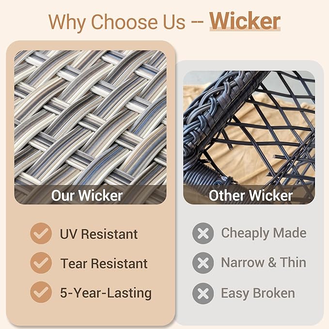 - All Weather & Durable: Selected anti-ageing treated thicken PE wicker rattan for UV resistant, wear resistant and all weatherproof. 3D strengthen and widen design for extended service life,twice service life as others